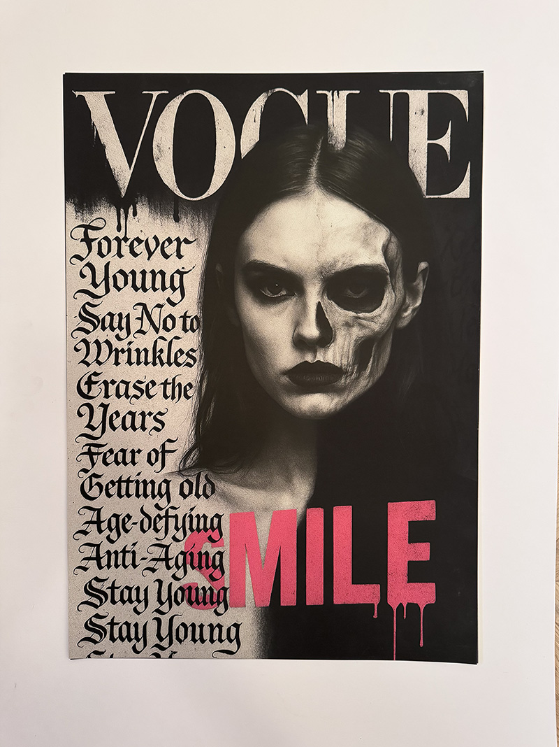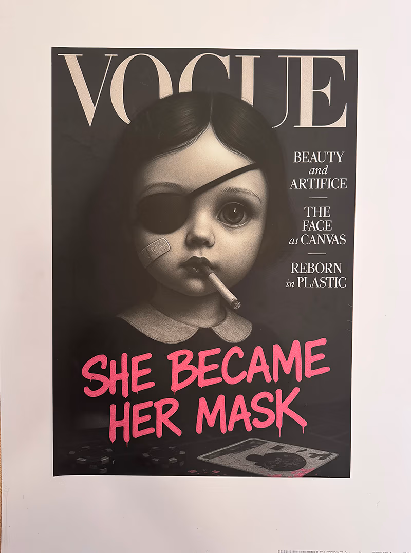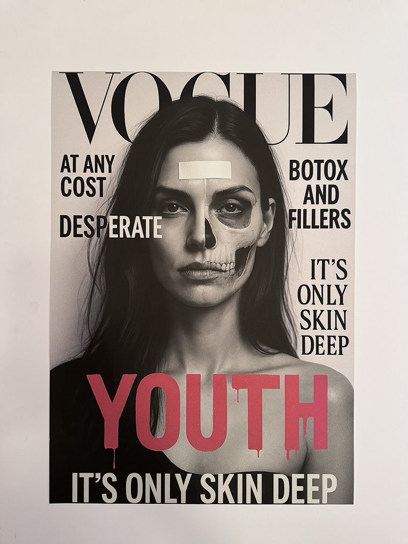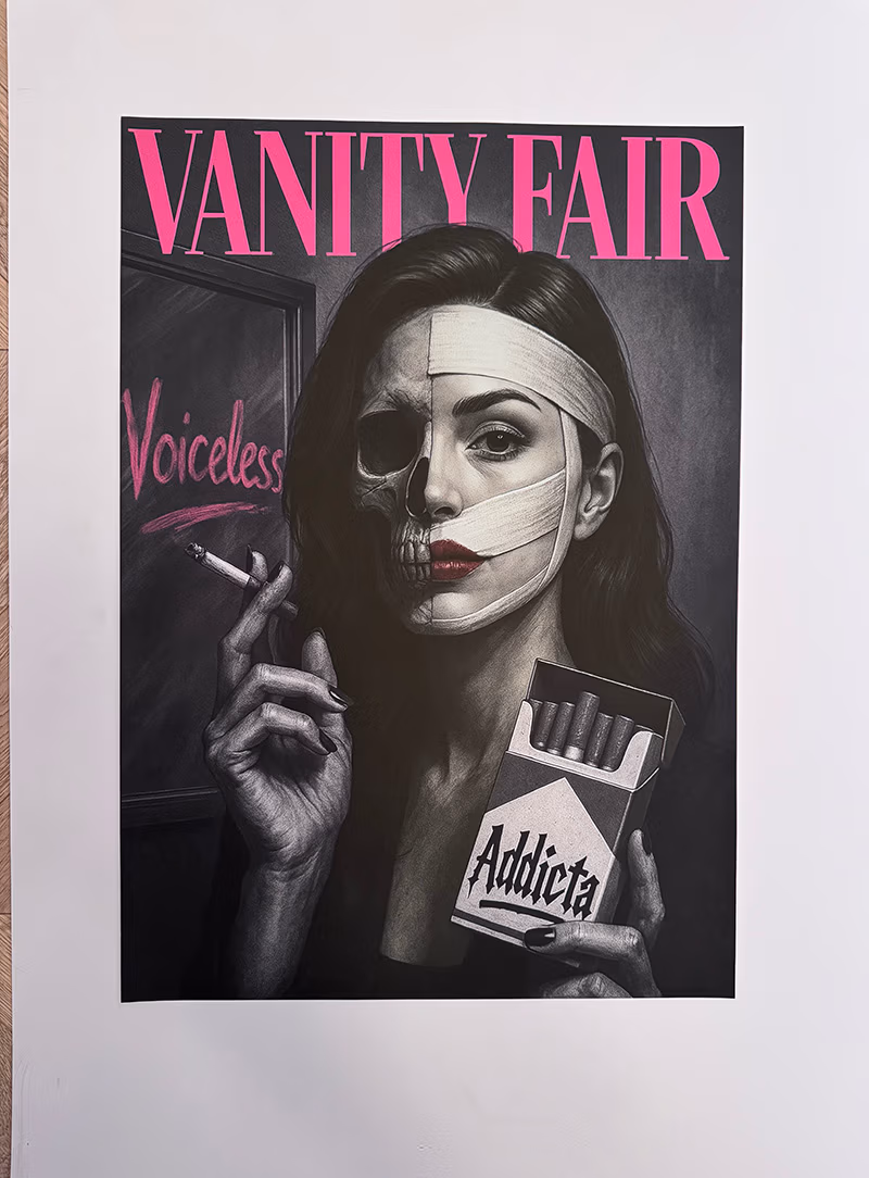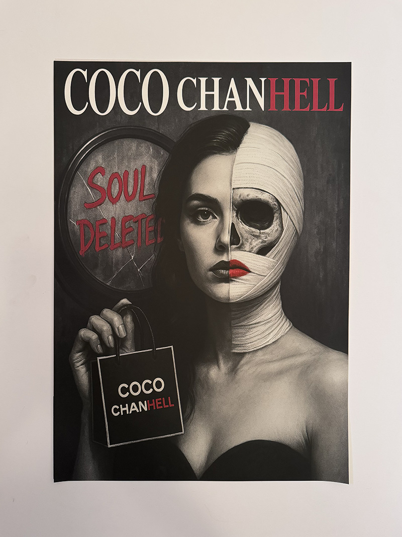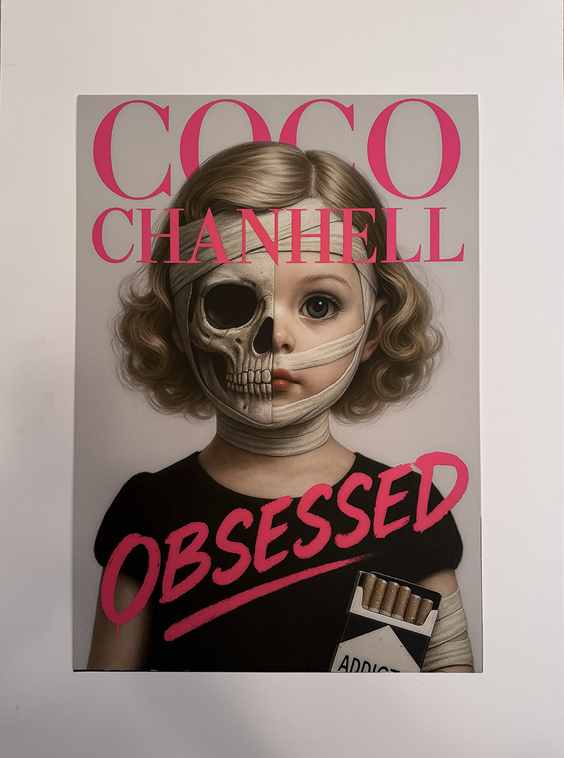 A haunting subversion of fashion magazine culture. An oversized doll-like child stares out from a mock Chanel cover, bandaged and smoking—surrounded by toxic beauty mantras. “Thinness is a choice. Diet constantly. Perfection through pain.” The work exposes the violence embedded in aspirational media.