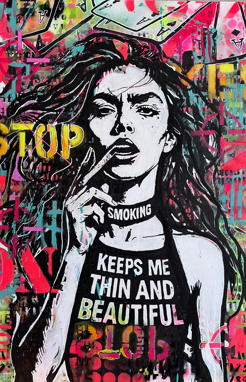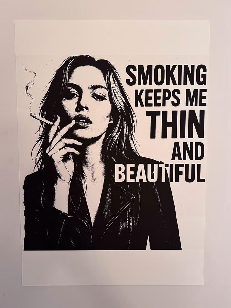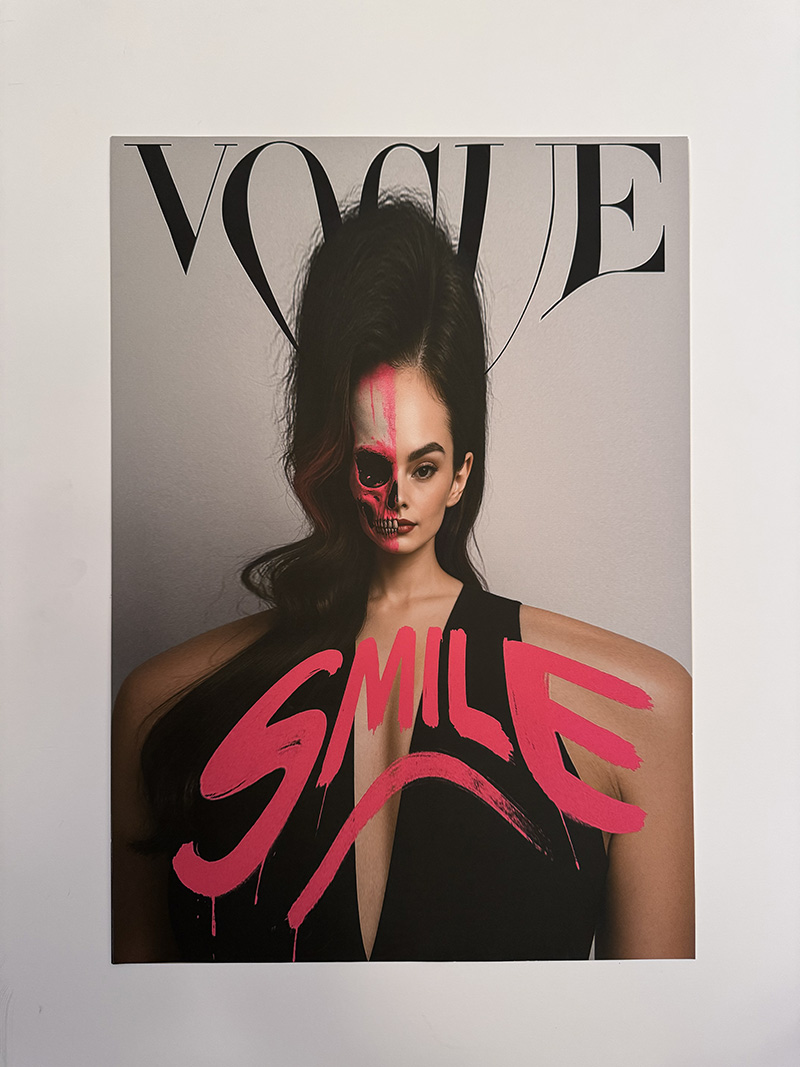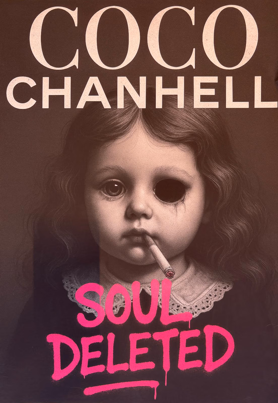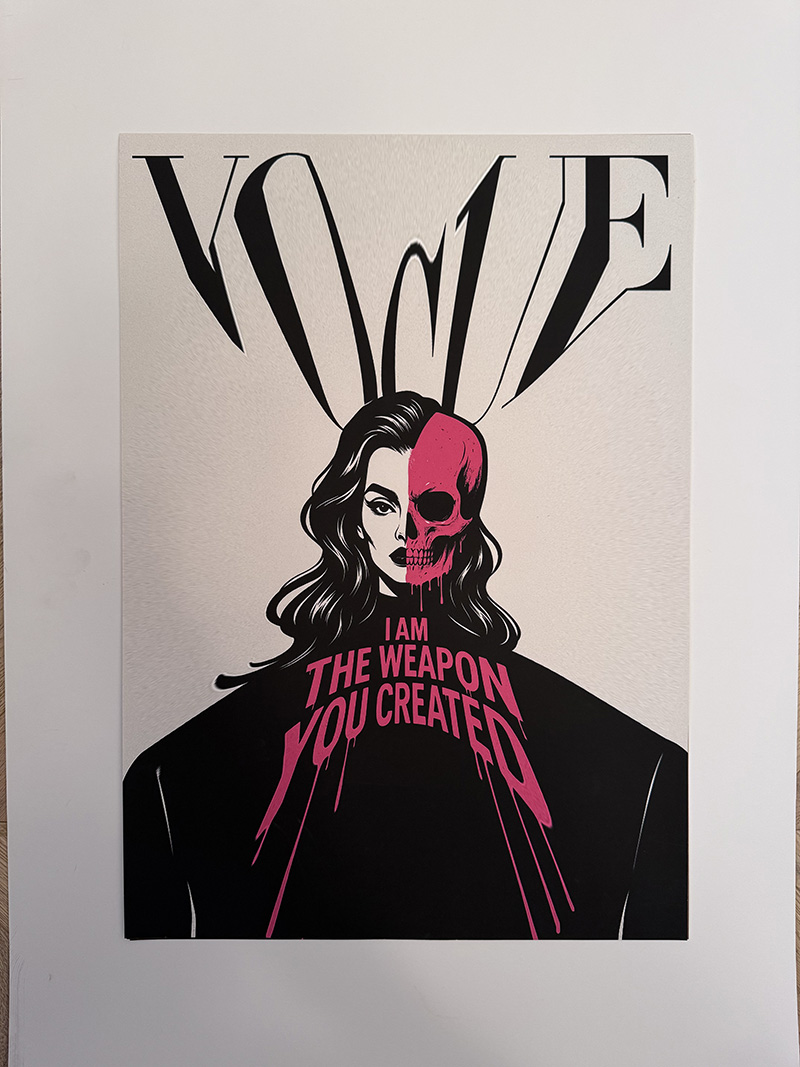 A haunting subversion of fashion magazine culture. An oversized doll-like child stares out from a mock Chanel cover, bandaged and smoking—surrounded by toxic beauty mantras. “Thinness is a choice. Diet constantly. Perfection through pain.” The work exposes the violence embedded in aspirational media.