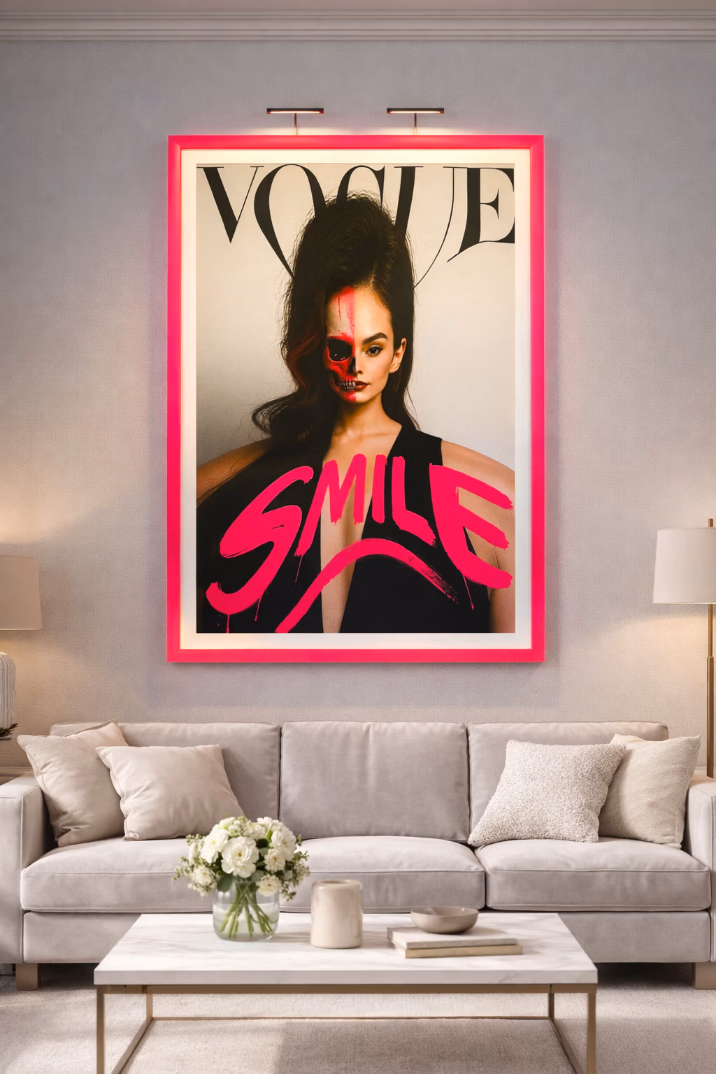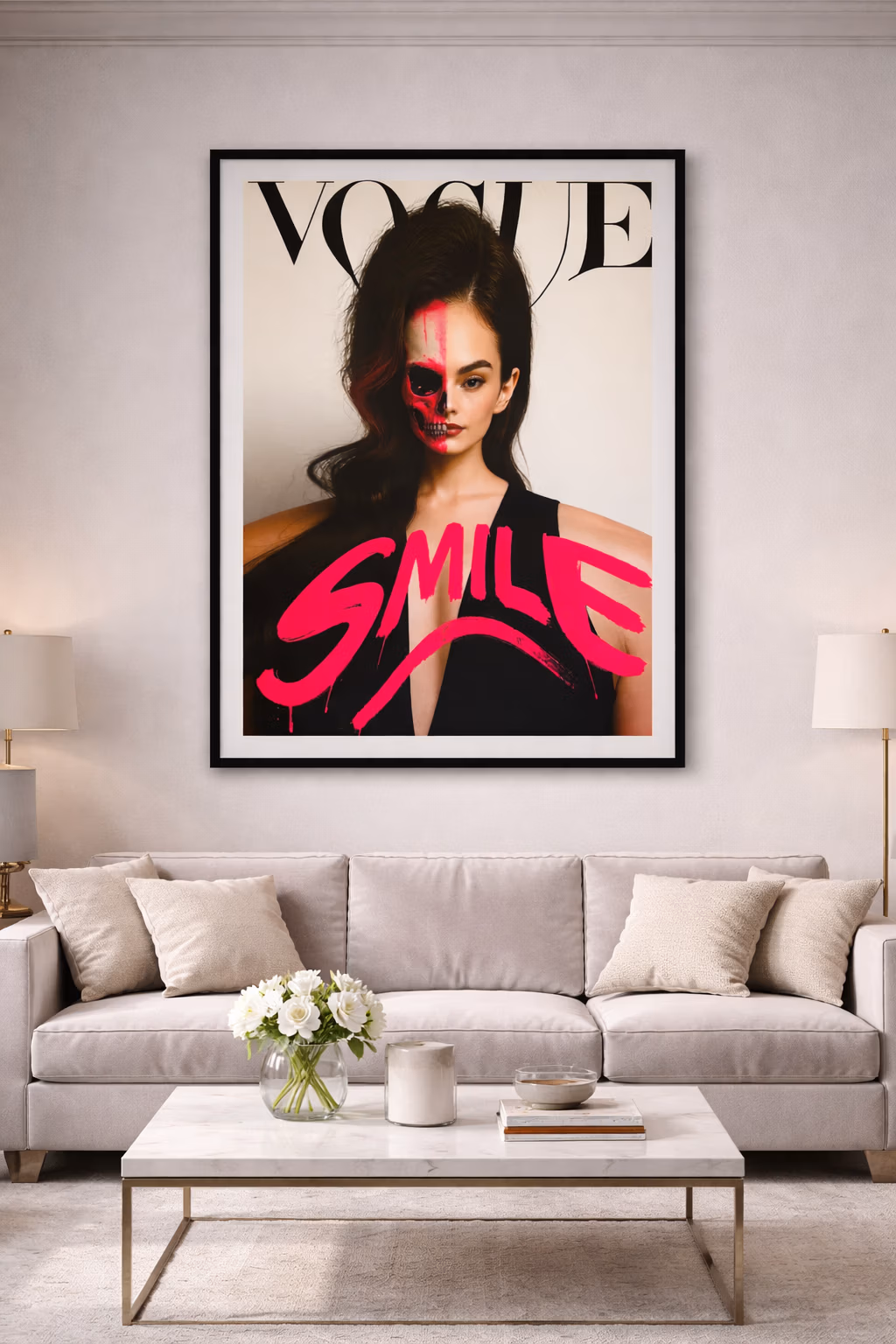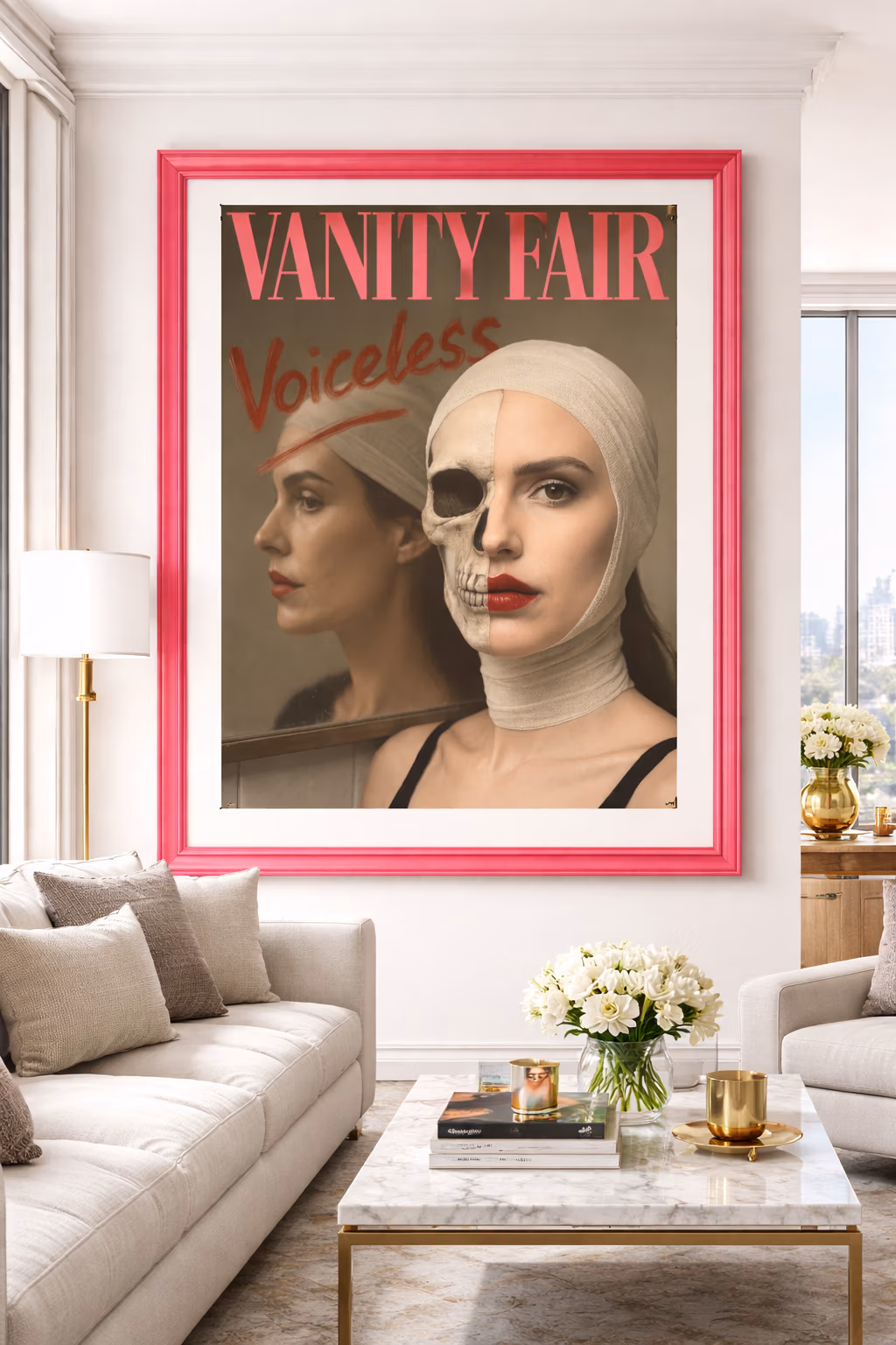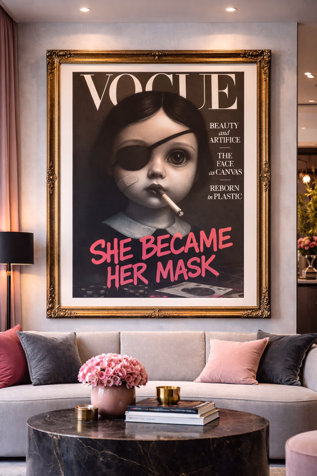 A haunting subversion of fashion magazine culture. An oversized doll-like child stares out from a mock Chanel cover, bandaged and smoking—surrounded by toxic beauty mantras. “Thinness is a choice. Diet constantly. Perfection through pain.” The work exposes the violence embedded in aspirational media.