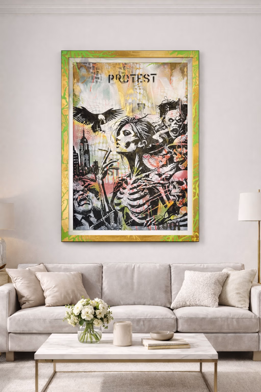 A layered explosion of resistance imagery. Police in riot gear frame a defiant woman giving the finger, surrounded by repeated words—”PROTEST”, “NO”, “F*CK OFF”. The composition is deliberately overwhelming, mirroring the sensory assault of confrontation between authority and dissent.